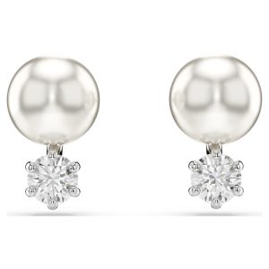 Matrix stud earrings Crystal pearl, Round cut, White, Rhodium plated