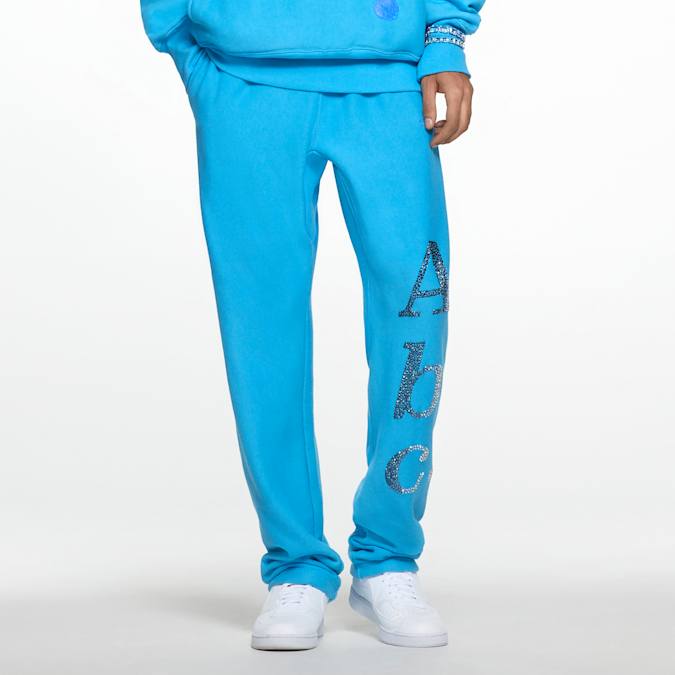 Abc. launches their melange sweats in collaboration with Swarovski. Set on an aquamarine base color, the Subjective Halos Sweatpants feature the Abc. logo along the left leg in luxe blue ombre crystals. Founded in 2015, cult label Abc. brings a comfortable cool to the Swarovski Creators Lab. The model is wearing a size large to achieve a relaxed fit.