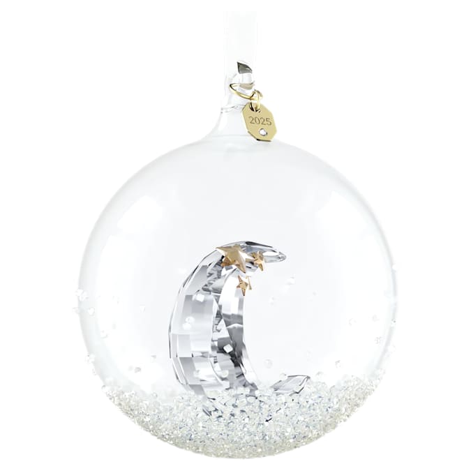 The Swarovski Annual Edition Ball Ornament for 2025 is illuminated with a lunar glow, making it a timeless gift to share with loved ones. The shimmering glass ball is embellished with around 2,200 crystals and hangs from a white grosgrain ribbon with a champagne gold-tone plated tag engraved with the year 2025. A serene crescent moon sits inside, adorned in golden-colored stars, and showcasing 158 precision-cut facets. This Annual Edition Ball Ornament is ideal for commemorating a birthday, wedding, or anniversary. Decoration object. Not a toy. Not suitable for children under 15.