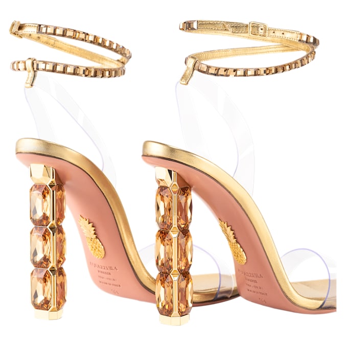 Defined by light-catching crystals and a Soft Gold colorway in laminated nappa leather and transparent plexi, the limited-release Aura sandal exudes the modern, vibrant elegance that Aquazzura is known for. Part of the Swarovski Creators Lab, this handmade design dazzles with statement heels featuring octagonal gold-colored crystals and glittering ankle straps paved with square-cut stones. Prepare to turn heads wherever you walk.