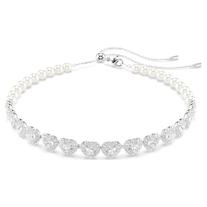 This radiant choker was made for an intense expression of love. The rhodium plated design is partly decorated with luxurious Swarovski Crystal Pearls, while at the front, there is a row of heart-shaped crystals, each surrounded by a glittering halo of clear pavé. A sliding closure at the back means you can adjust the jewelry to your perfect fit. Pair this bold necklace with other matching jewelry to create your own romantic combinations.