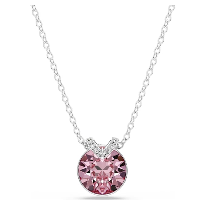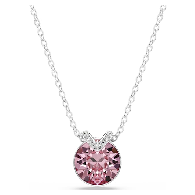 This romantic pendant has eye-catching appeal thanks to its central pink crystal set in rhodium plating. A flourish of shimmering pavé adds an extra layer of beauty, while the delicate chain exudes pure elegance. Wear it together with the matching earrings for a wondrous combination.