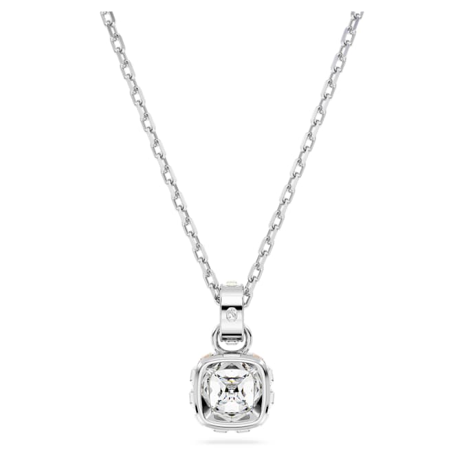 This delicate pendant is inspired by the birthstone of April. Hanging from a fine chain with a shimmering link of crystals, the rhodium plated jewelry features a single square-cut stone in a clear hue, representing strength, clarity, and the power within. This meaningful design makes a magical birthday gift or can be worn to celebrate a time that is significant to you.