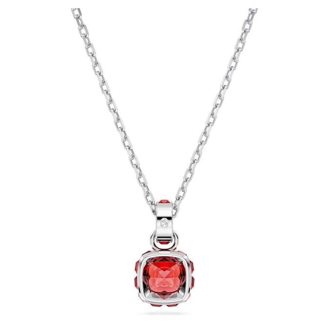 This delicate pendant is inspired by the birthstone of July. Hanging from a fine chain with a shimmering link of crystals, the rhodium plated jewelry features a single square-cut stone in a ruby red hue, representing a mysterious yet magical vitality. This meaningful design makes a magical birthday gift or can be worn to celebrate a time that is significant to you.