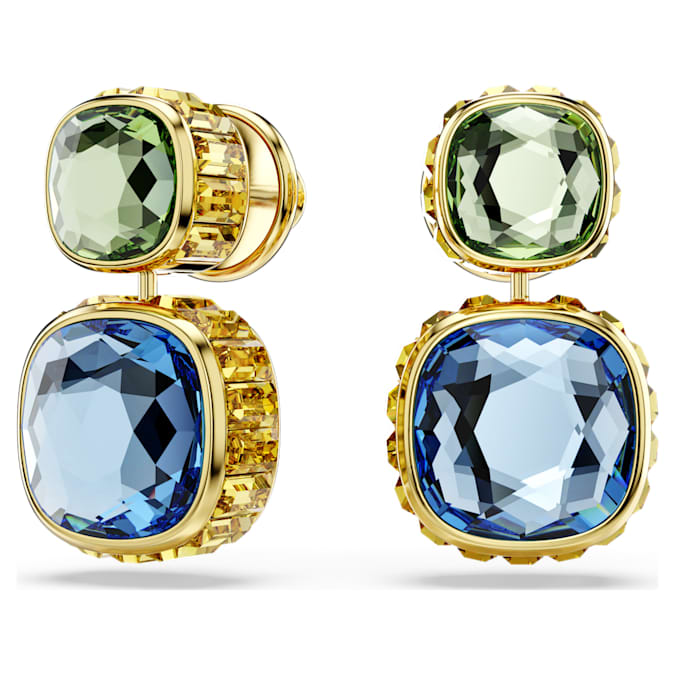 With different colors on each side, these Chroma Twist pierced earrings are wonderfully versatile. Each gold-tone plated piece connects to the ear with a Swarovski ReCreated™ crystal in green. Below, the reversible design means you can either display a Swarovski ReCreated™ crystal in blue or a vibrant crystal in pink. The choice is yours. Create playful pairings with other jewelry from this collection and let your joyful side shine. Chroma Twist jewelry contains at least 50% Swarovski ReCreated™ crystals, and it is our first collection designed with circularity in mind.