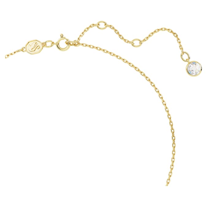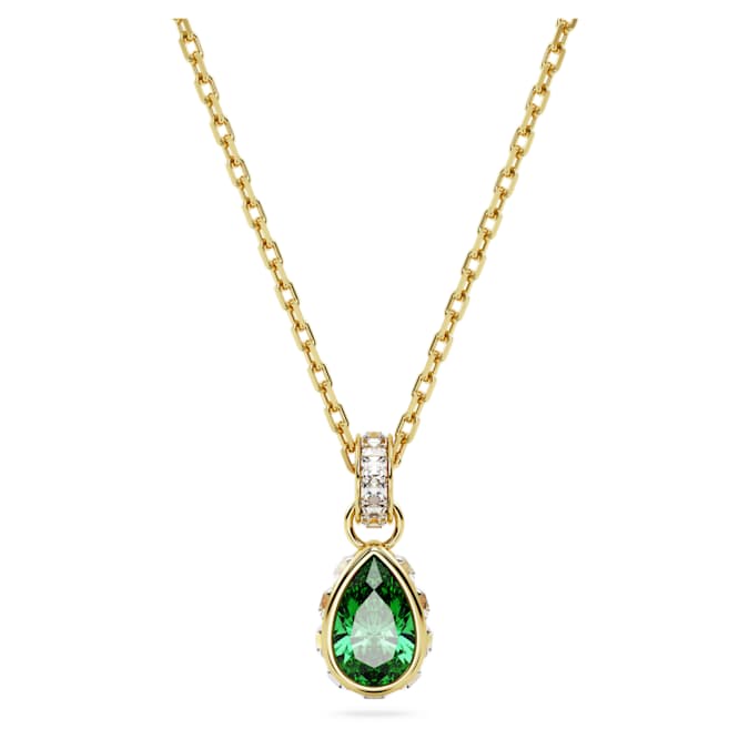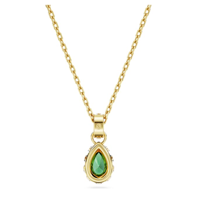This shimmering pendant from the Chroma family is small yet powerfully beautiful. Like a droplet of light, the pendant features a pear-cut green centerstone in a gold-tone plated surround enhanced with square clear crystals around the edges and the bail. Beautifully attached to a gold-tone plated chain with a round stone detail at the end and a 5cm elongation, this is a piece you can wear every day, making it a signature part of your style.