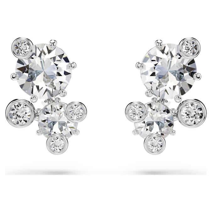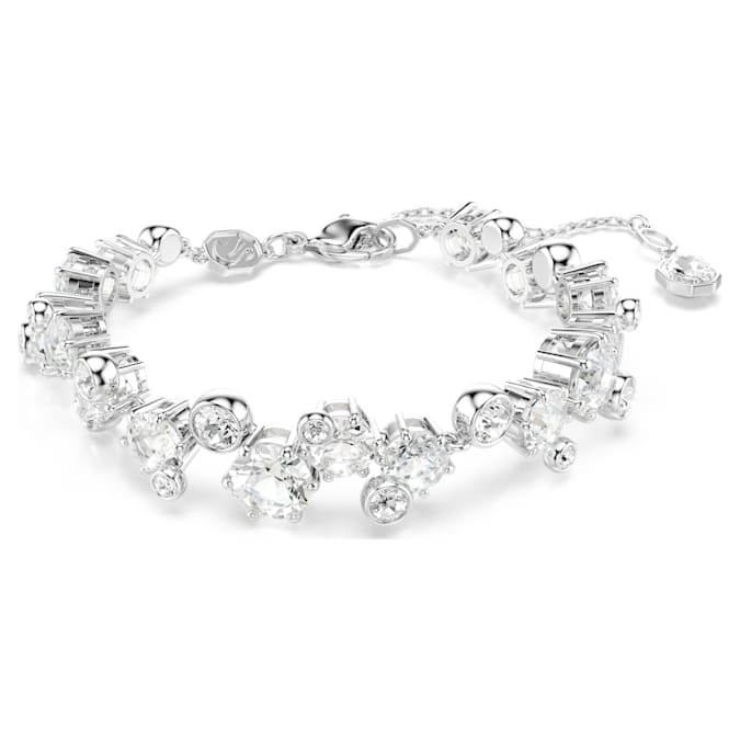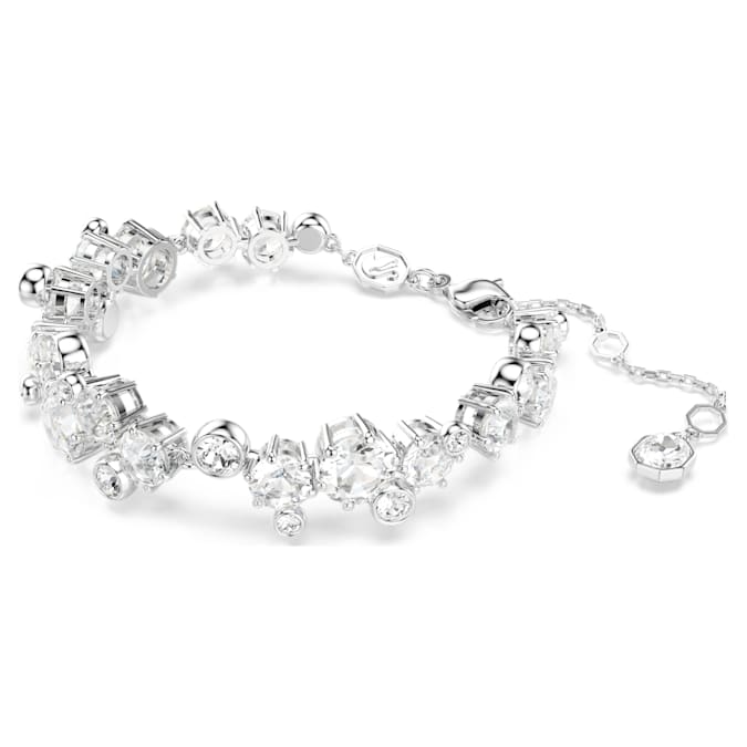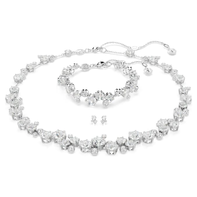 Let your style shine brighter with the matching necklace, bracelet, and studs in this starry Constella set. Each of the three rhodium plated pieces showcases clear crystals in various sizes, displayed in a prong or bezel setting. The necklace and bracelet also include octagonal stations for an easy size adjustment. It’s a cluster of light that adds pure radiance to any look.