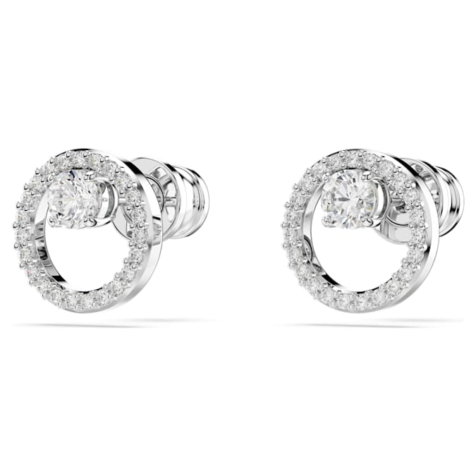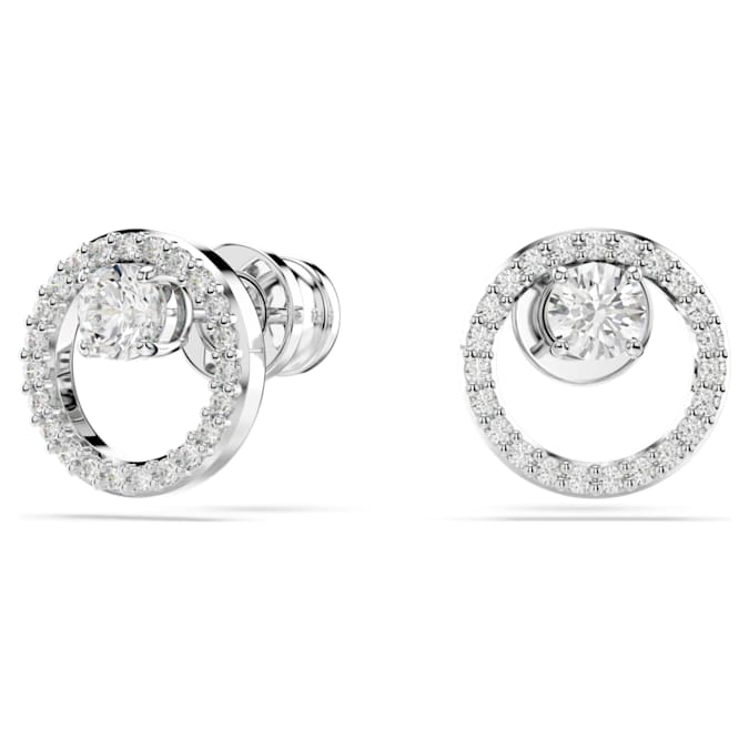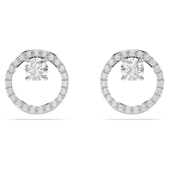 These refined circle studs exude timeless elegance. Each pierced piece is rhodium plated and features a central pavé ring of clear Swarovski Zirconia as well as a single prong-set Swarovski Zirconia placed in the middle. Amp up the drama by pairing with a matching Constella pendant.
