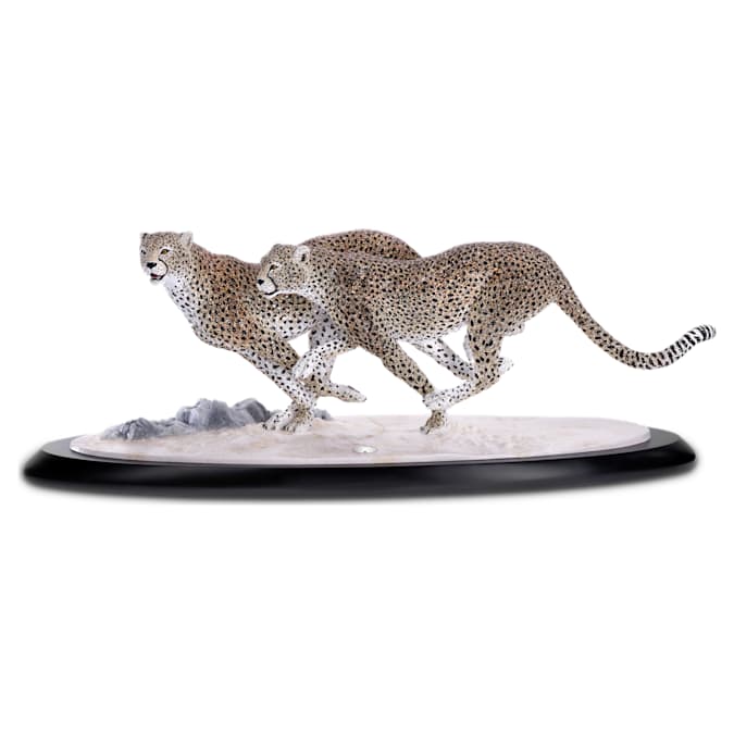 Captured in elegant and powerful motion, this exceptional sculpture displays the full potential of our Pointiage® technique, with an array of brilliant crystals that bring the animals to life. The dynamic design features two sprinting cheetahs on the African savannah, with typical tear-shaped stripes from the eyes to the mouth and spotted fur that is detailed to the highest level of mastery. The name Asuga means “swift” and “wind”, a perfect representation of the style of this piece. This creation will enhance any home as a testament to the uniqueness and beauty of these animals, as well as the importance of protecting their delicate habitat. This piece is made to order. Decoration object. Not a toy. Not suitable for children under 15.
