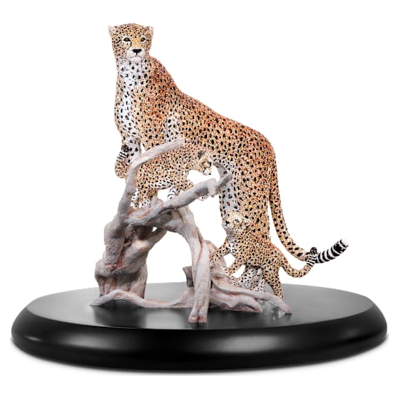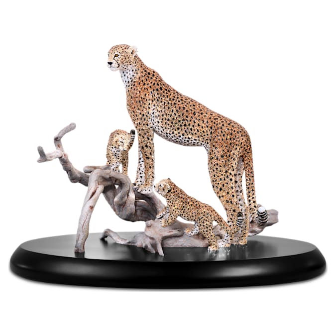 A majestic family of cheetahs takes center stage in this powerful and thought-provoking sculpture, which takes 324 hours to complete. Fashioned with more than 53,000 crystals, it is an exquisite example of our Pointiage® technique, displaying the skill and precision of our master craftspeople. The animals feature their typical tear-shaped stripes from eyes to mouth and spotted fur that is exceptionally detailed. The name Mirembe means “peace and quiet”, a perfect representation of this tranquil scene with a mother cheetah and her two young cubs. This creation will enhance any home as a testament to the uniqueness and beauty of these animals, as well as the importance of protecting their delicate habitat. This piece is only available in a limited worldwide number of 200. Decoration object. Not a toy. Not suitable for children under 15.