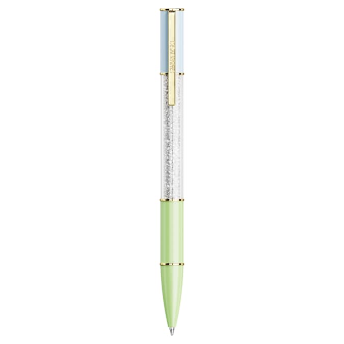 The luxurious Crystalline ballpoint pen takes inspiration from vivid color. This distinctive writing instrument features a round barrel in blue and green, as well as gold-tone accents that include a functional clip engraved with the Swarovski name. At its center, this eye-catching design is illuminated with approximately 480 glittering crystals, each meticulously added using the iconic Crystalline technique. A standout addition to your desk or a distinctive gift for the writers in your life. Black and blue ink refills are available to buy in Swarovski stores.