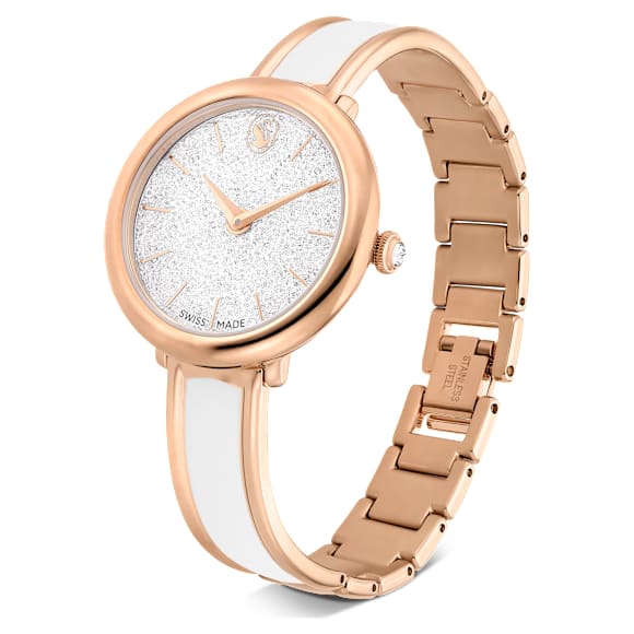 Part jewelry, part timepiece, this Crystalline watch is a glittering everyday accessory. The 32mm stainless steel design is rose gold-tone finished and is worn around the wrist on an adjustable bangle that features an elegant mid-section in white enamel. In a sublime example of Swarovski’s Crystalline technique, the dial is decorated with around 1,016 crystals, which shimmer between the slender hour markers and Swan logo at 12 o’clock. An additional crystal is also placed within the crown. This Swiss made watch is water resistant to 50 meters and delivers scintillating style at all hours of the day.