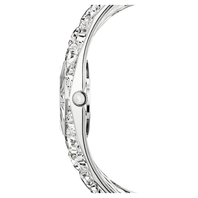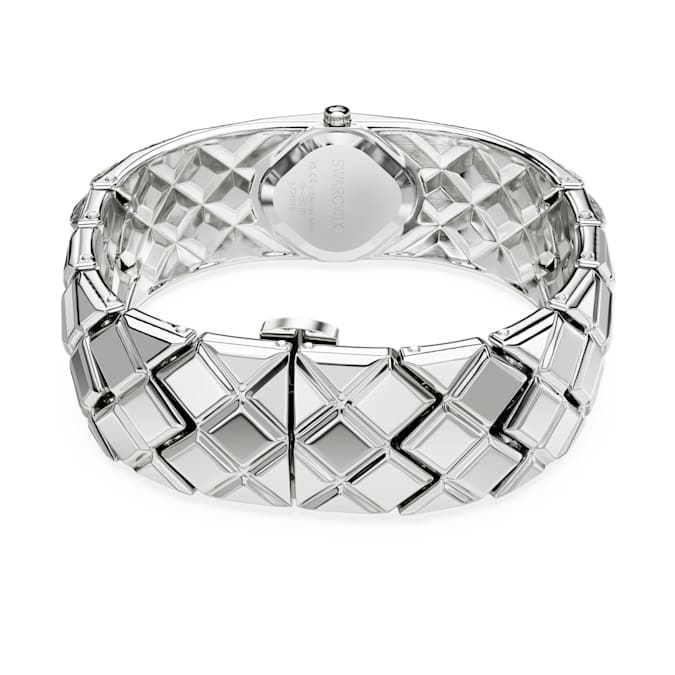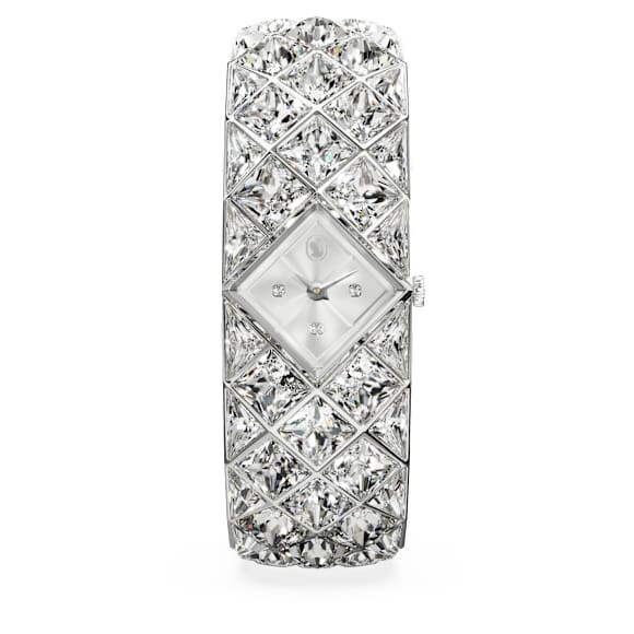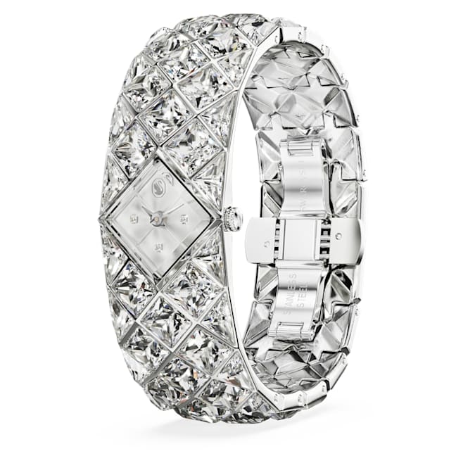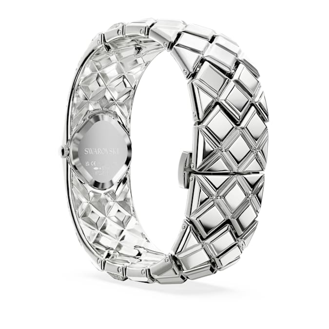 With a total of 47 crystals, the luxurious spirit of Curiosa is beautifully expressed in this bangle-style timepiece, which showcases Swarovski’s heritage and savoir-faire. The stainless steel design is a vintage-era tribute, featuring a 20mm (w) x 20.5mm (l) case that sits neatly within a stunning bracelet set with triangle- and fancy-cut crystals. The dial also includes crystals at the quarter hour markers. A glowing accessory for your most sophisticated occasions, this watch is water resistant to 50 meters and reveals the iconic Swan logo at 12 o’clock.