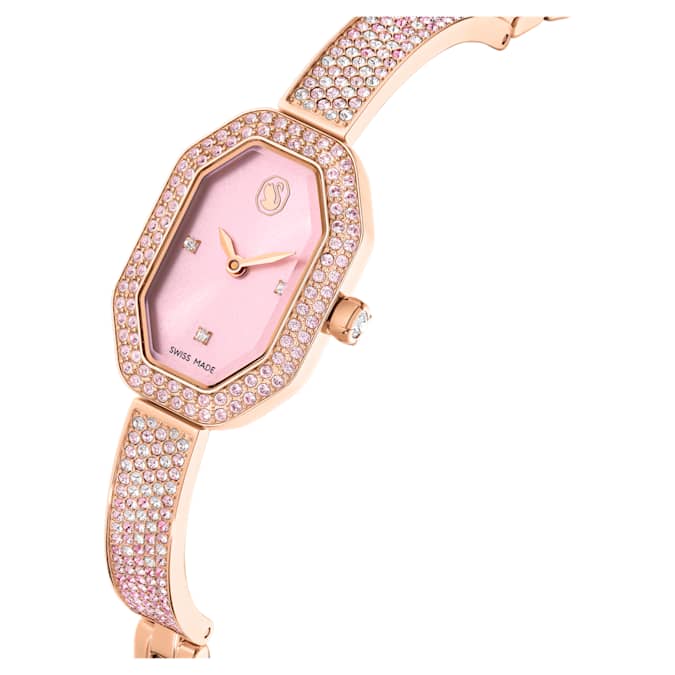 This light-catching Dextera bangle watch is crafted in Swarovski’s renowned octagon shape. The 12.4 x 20.8 mmcase features a rose gold-tone finish and is adorned with a pavé of 92 pink crystals on the bezel. This provides a perfect frame for the pink sunray dial, which includes a swan logo at 12 o’clock and three crystallised index markers. Along with a single crystal set in the crown, the watch is also brought to life by a gradient of 197 pink crystals set along the adjustable bracelet, providing exceptional beauty at every hour. This Swiss Made watch is water resistant to 50m and combines joyful extravagance with signature Swarovski savoir-faire.