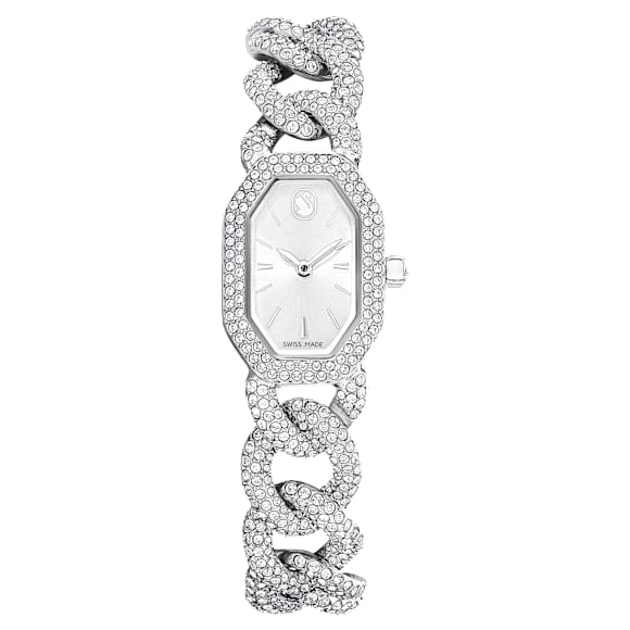 Highlighting Swarovski’s iconic octagon shape and set with 623 crystals, this dazzling watch wears like a piece of fine jewelry. The stainless steel case measures 44mm in length and features a shimmering pavé on the bezel alongside a sunray dial with an elegant swan logo at 12 o’clock. The watch is worn around the wrist on an adjustable gourmette chain embellished with 530 crystals, while a single crystal is also set within the crown. This Swiss made watch is water resistant to 30 meters and is a spectacular choice for everyday glamour and special occasion opulence.