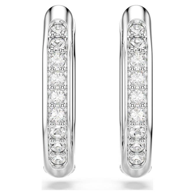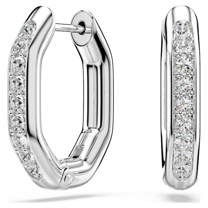 Make an expressive statement with these geometric hoop earrings. Their slender octagonal design creates a bold frame for the single row of clear round-cut crystals, which are each placed in a delicate prong setting. A special spring plate mechanism makes these earrings easy to open and close, while the rhodium plating is ready to mix and match with other Dextera pieces.