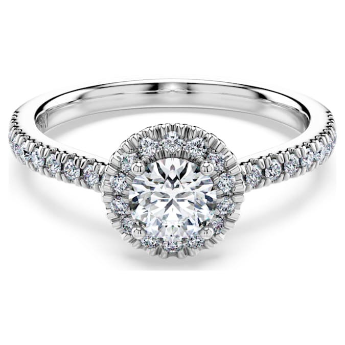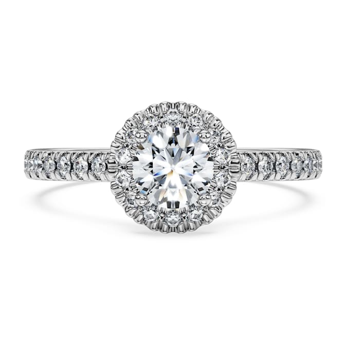 Embrace pure radiance with the exquisite savoir-faire of this Eternity ring. The 14K white gold design features a dazzling pavé halo of laboratory grown diamonds, with a round laboratory grown diamond at the center. Totaling 0.8 carat, this stunning engagement piece can be paired with a matching band ring for maximum impact. This jewelry is IGI (International Gemological Institute) certified and is part of the Eternity collection.