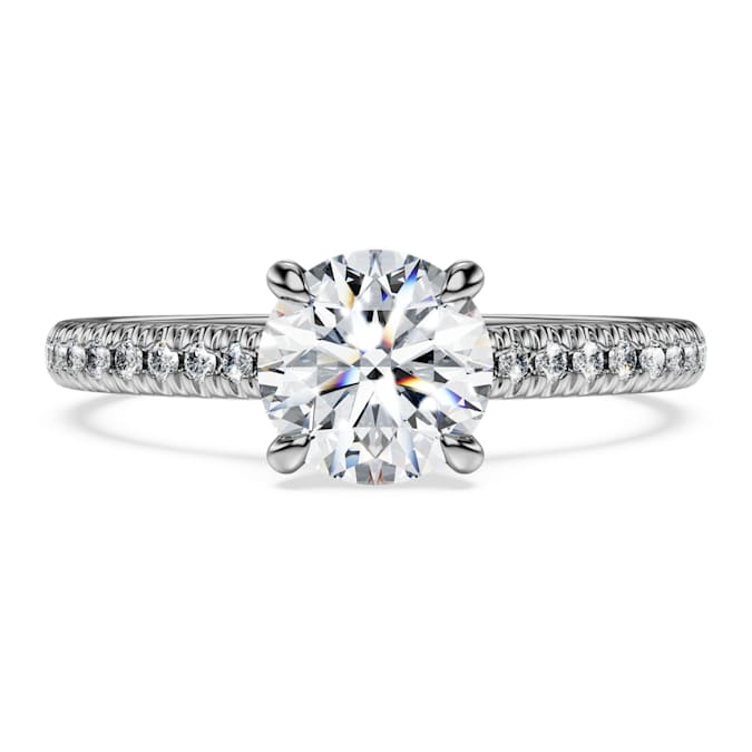 Every detail of this radiant Eternity ring has been crafted to catch the light. The 14K white gold design is detailed with small laboratory grown diamonds, while a round, prong-set laboratory grown diamond sits at the center – all totaling 1.2 carat. An elegant piece of beauty that makes a sensational engagement choice. This jewelry is IGI (International Gemological Institute) certified and is part of the Eternity collection.