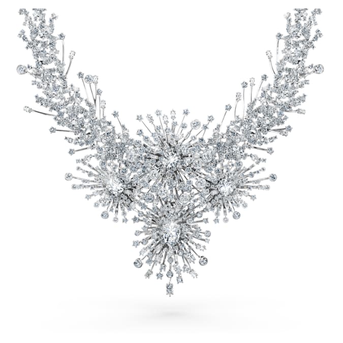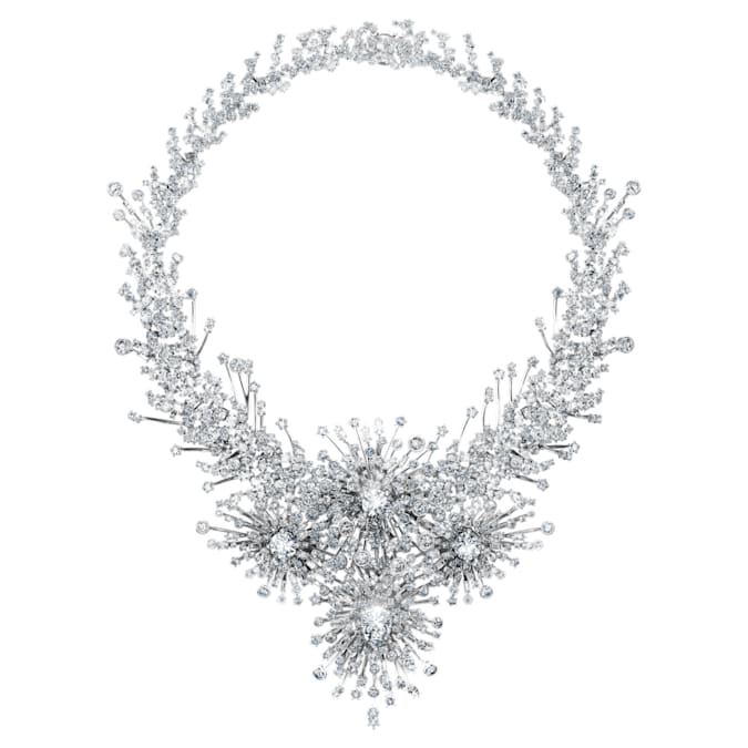 This incredible showpiece necklace provides the ultimate display of Swarovski savoir-faire, and shines bright with an abundance of artistic skill. The entire 18K white gold design features an explosion of laboratory grown diamonds, all presented in a variety of shapes and sizes, and each faceted for maximum brilliance. With each stone extending in different directions, the necklace delivers a star-like quality that shimmers from every angle. A dramatic piece that truly captures the wonders of the galaxy. This jewelry is part of the Galaxy collection created by Giovanna Engelbert. The laboratory grown diamonds in the Galaxy collection are graded and certified by IGI (International Gemological Institute) according to the 4Cs of diamond quality. This piece is made to order.