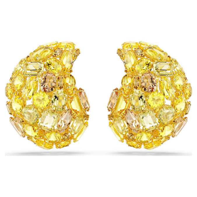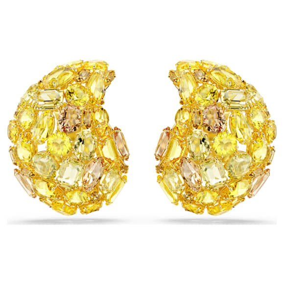 Like two drops of golden sunshine, these bright clip earrings are a joyful accessory. Each gold-tone plated piece reveals a collision of crystals in various cuts and yellow and amber tones. A pair that is emblematic of Gema’s unexpected formations and vibrant beauty, they glow even brighter when worn alongside matching jewelry pieces from the same family.