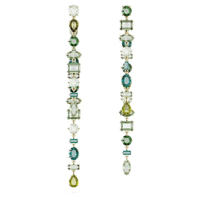 Inspired by nature, energizing emerald hues give these drop earrings a rich vibrancy. Each earring has two asymmetrical strands crafted with a mix of stone cuts, featuring a multitude of green tones complemented by a gold-tone plated setting. A beautifully bohemiam piece to gift to a loved one – or yourself.