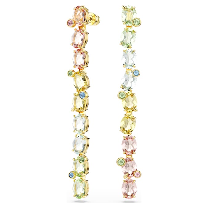 Dial up the color in your style with these effervescent pierced earrings. Each gold-tone plated piece features a long strand of large crystals in multiple hues, alongside smaller crystals in a joyful bubble prong setting. Playful, unexpected, and ready to face the day, these cascading earrings can be matched with a Gema pendant or bracelet for an ultra-joyful look.