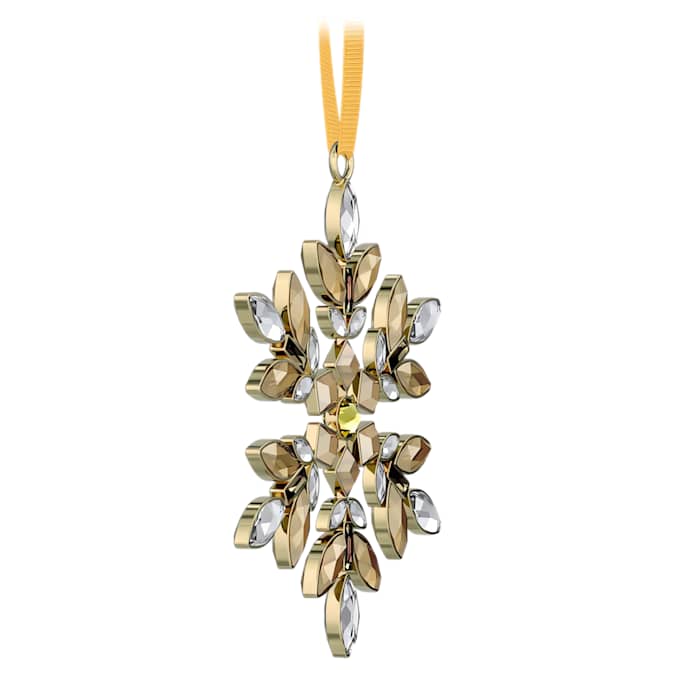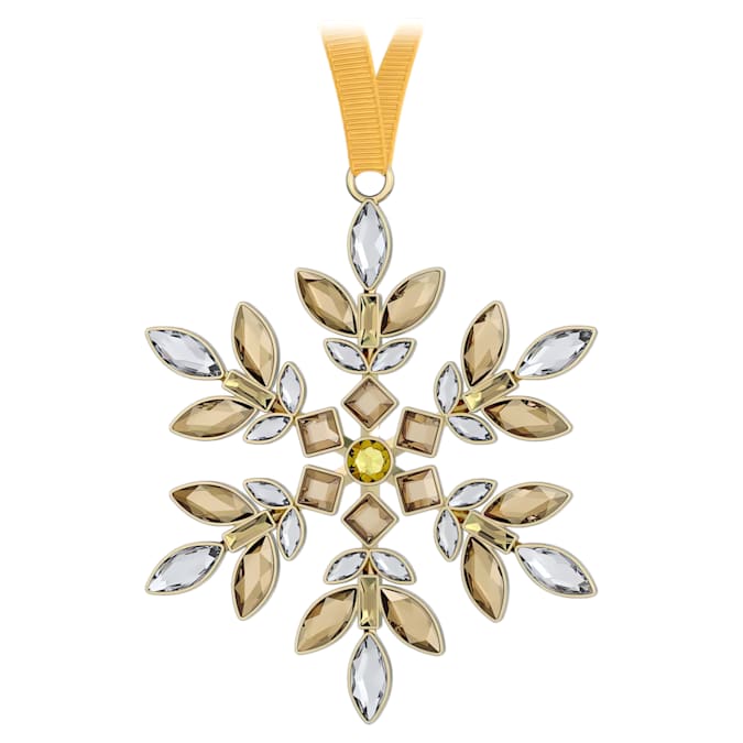 Inspired by the vibrant Gema family, this collection of radiant snowflake ornaments is presented in Swarovski brand colors with a nod to the holiday season. This yellow piece is formed from 86 individual crystals in a variety of cuts and shades, applied on both sides using jewelry stone setting techniques. The design is suspended from a yellow grosgrain ribbon and is completed with a glossy gold-tone finish. Collect all four of the Gema snowflake ornaments to create a joyful multicolored display in your home. Decoration object. Not a toy. Not suitable for children under 15.