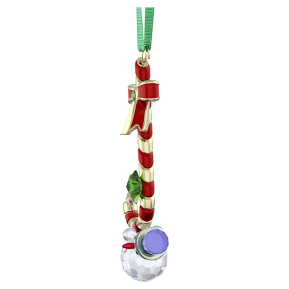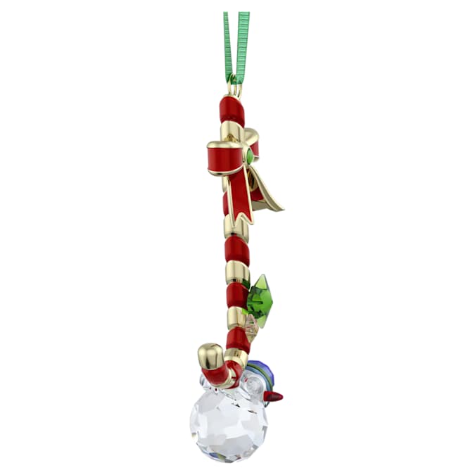 A crystallized sweet treat, this candy cane ornament is playful and charming. The design features a radiant candy cane with a suspended snowman and is crafted with 266 facets in festive shades. Hanging from a green grosgrain ribbon, the design is completed with glossy metallic accents. Gift to a loved one or place under your tree to raise a smile. Decoration object. Not a toy. Not suitable for children under 15.