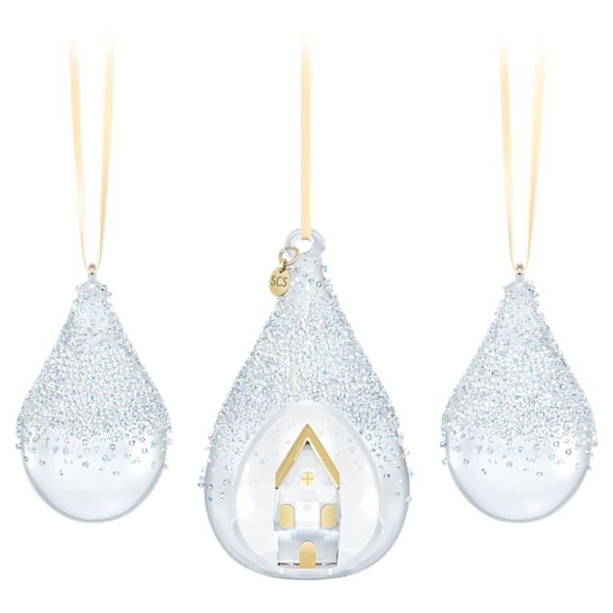 Designed exclusively for SCS members, this set of three drop-shaped ornaments takes our Holiday collection in a new design direction. Inside the larger ornament is a miniature, clear, crystal house with champagne gold-tone, metal accents. With a total of 62 crystal facets and gold-tone, satin ribbons, the ornaments can be displayed on a tree, in a window, or using our new Ornament Stand, Gold Tone or Bell Jar Display, large. The set would make a wonderful gift to celebrate any special moment this year, such as a new arrival, wedding, anniversary or new home. Decoration object. Not a toy. Not suitable for children under 15.