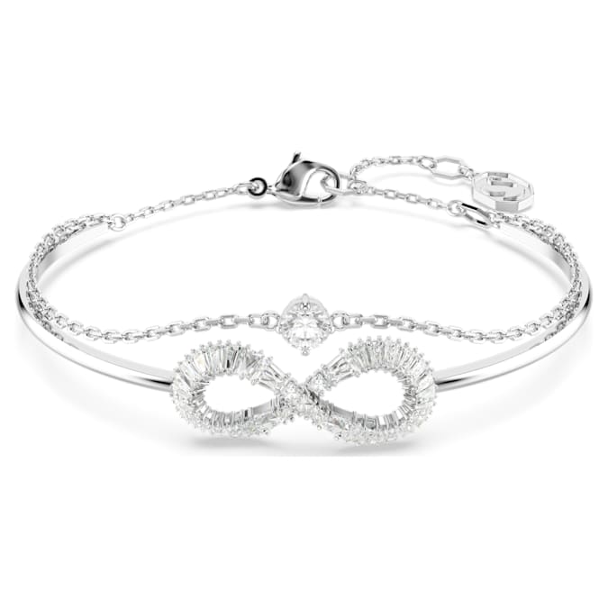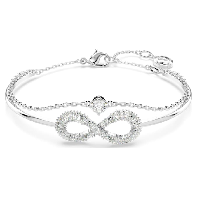Infused with delicate beauty and symbolism, this Hyperbola bangle can be worn time and time again. The rhodium-plated design features a rigid band with an infinity motif, which is adorned with clear Swarovski Zirconia. A second chain has also been added, with a single round Swarovski Zirconia set at the center. A stunning double-wrapped bangle that will effortlessly carry you from day to night.