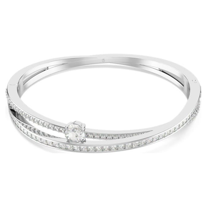 This twisting Hyperbola bangle is a design marvel. Featuring two overlapping rhodium plated bands, the piece is adorned with clear Swarovski Zirconia in channel and prong settings. An additional oval-cut crystal is placed in between for added impact. Style this intricate jewelry with a minimalist outfit to showcase the beauty in contrast.