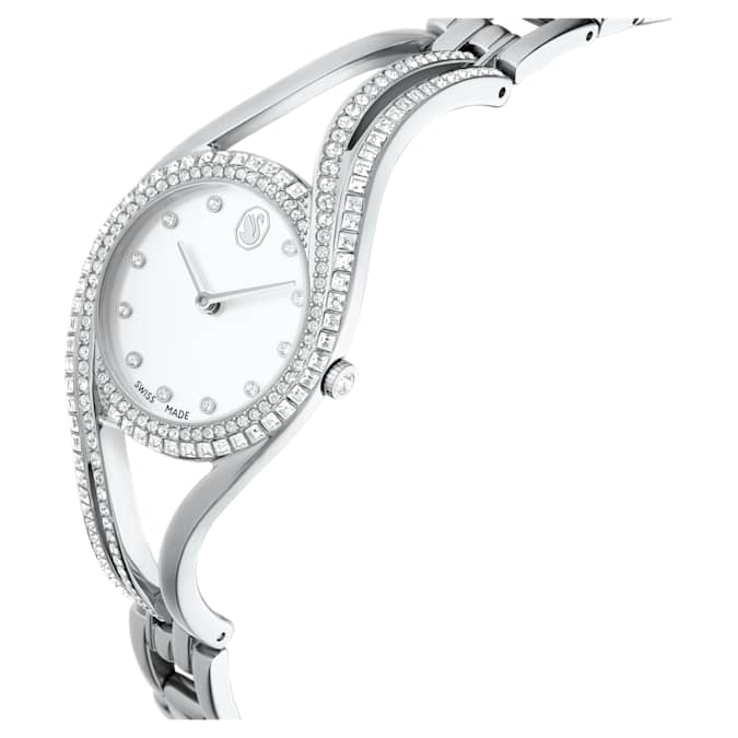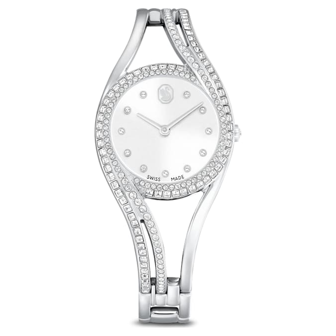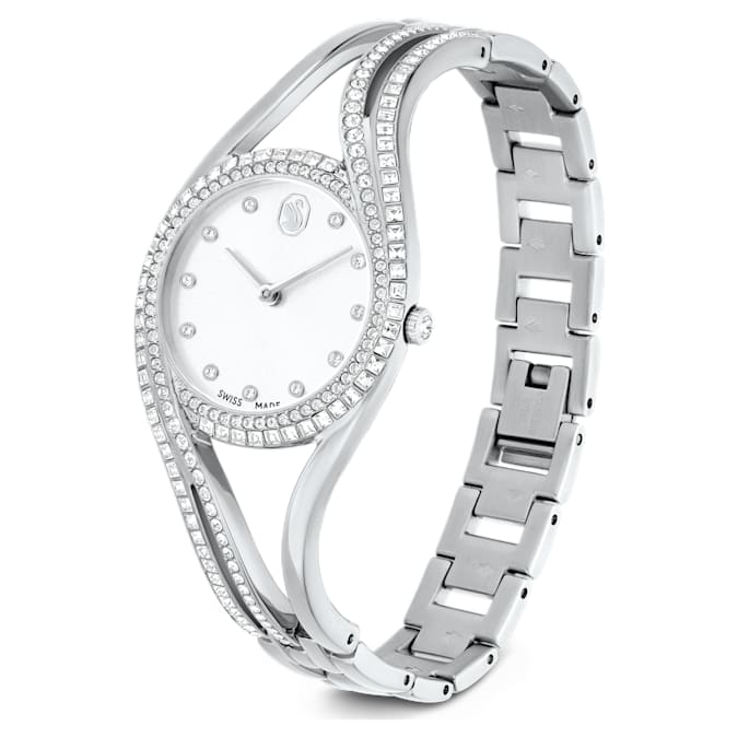 Distinguished by elegant curves and a sense of refinement, this Hyperbola bangle watch blurs the line between jewelry and timepiece. The 28mm stainless steel case features a combined bezel and bracelet set with 176 clear crystals in princess and round cuts. The sunray dial also displays 11 hour markers made with crystals, along with a Swan logo at 12 o’clock. For a beautiful finishing touch, this Swiss Made watch includes a single crystal set within the crown, while offering a water resistance of 50m. It’s a modern timepiece choice that combines artistry with impeccable savoir-faire.