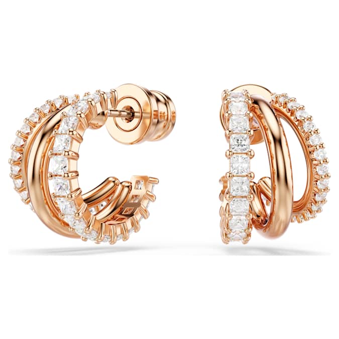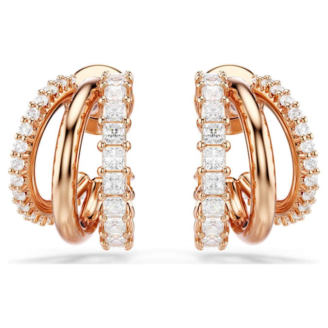 These intricately crafted Hyperbola earrings showcase a unique beauty. On each side, the three mini hoops are presented in rose gold-tone plating, adorned with round- and square-cut Swarovski Zirconia in a prong setting. Style with a matching bangle or necklace for a showstopping look.