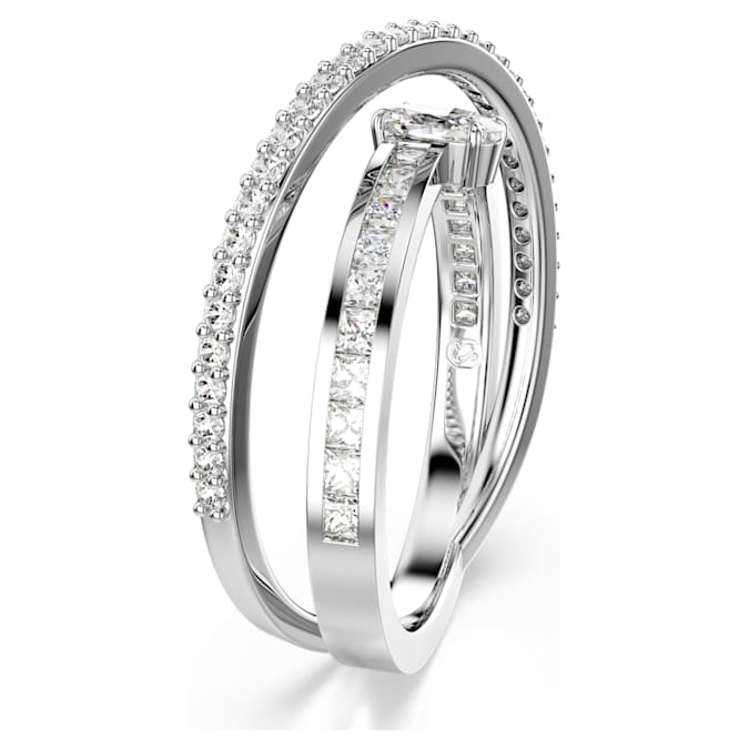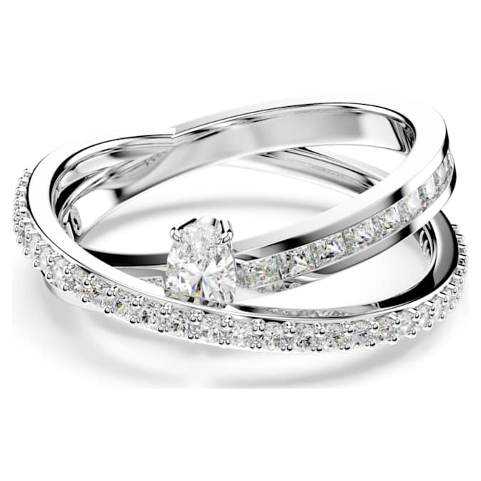 This twisting Hyperbola ring integrates multiple styles in one beautifully compact design. Its two overlapping rhodium plated bands are adorned with clear Swarovski Zirconia in channel and prong settings. An additional oval-cut crystal is placed in between for added impact. Pair with a matching bangle for a truly showstopping look.