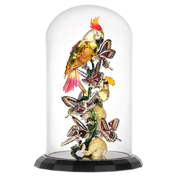 An extraordinary showcase of nature comes to life in this exquisite Idyllia bell jar. Beneath the domed glass, Swarovski’s savoir-faire is in full flight with an array of creatures displaying astonishing design techniques, as well as extraordinary cuts and colors. In total, the creation features 1,366 facets and 5,628 stones set with Swarovski’s patented Pointiage technique. The exotic cockatoo, the royal flycatcher, and the splendid multi-colored butterflies are all exceptionally beautiful. Limited to just 200 pieces, the Idyllia bell jar will add unmatched wonder to your home. Decoration object. Not a toy. Not suitable for children under 15.