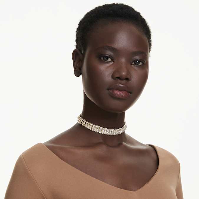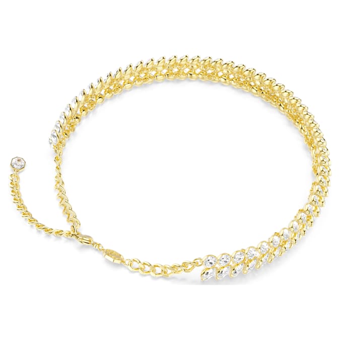Crafted for maximum radiance, this gold-tone plated choker follows the expressive pattern of foliage, giving you a nature-inspired piece of jewelry for a statement look. The gold-tone plated design features two continuous rows of around 144 oval crystals in prong settings, which combine to create a stunning effect. It’s the ultimate example of Swarovski savoir-faire and is perfect for highlighting your own individual style.