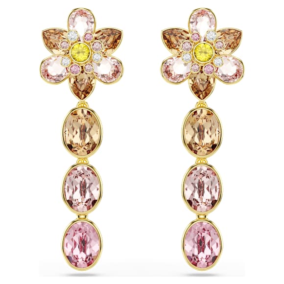 Designed to make a statement, these gold-tone plated earrings are a symphony of color and light. Each piece reveals a flower made from crystals in various cuts and colors, and then features a drop of three bezel-set crystals in the same soft tones. This nature-inspired pair is ideal for everyday styling and matches beautifully with other jewelry choices from the Idyllia family.