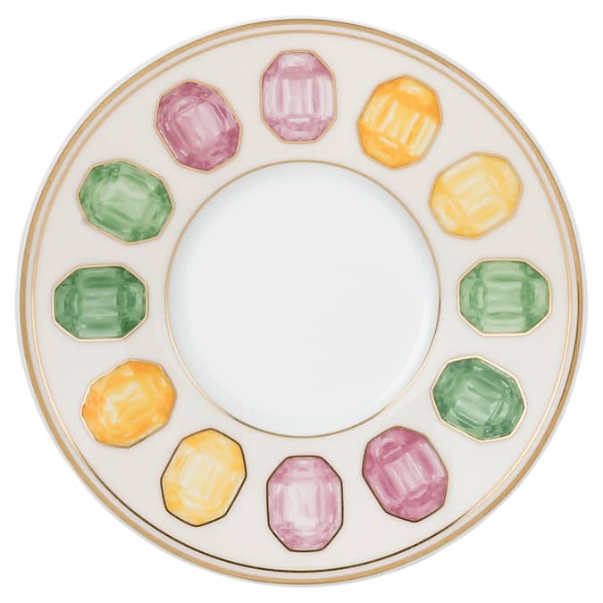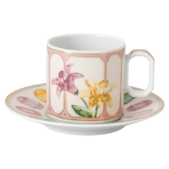Inject even more energy into a fresh cup of coffee with this faceted espresso cup and saucer. Using an exclusive technique, the pink and marshmallow porcelain is printed with a wondrous motif that captures the essence and radiance of crystals. This includes bright lilies on one side of the cup, and a blossoming lemon on the other, while the saucer features a colorful gemstone print. Created in partnership with porcelain brand Rosenthal, it is further decorated with fine gold-tone lines, giving you a mood-boosting addition to any table setting. This espresso cup and saucer is dishwasher safe, but not suitable for use in a microwave.