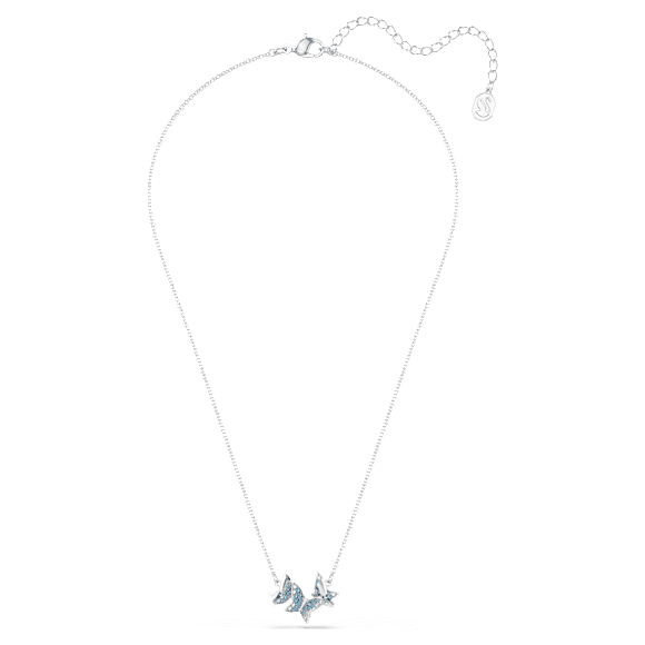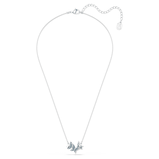 This elegant Lilia necklace features a central motif of floating butterflies adorned with shimmering blue pavé on a rhodium plated setting. This is an easy choice to enhance your outfit with a touch of nature-inspired wonder.