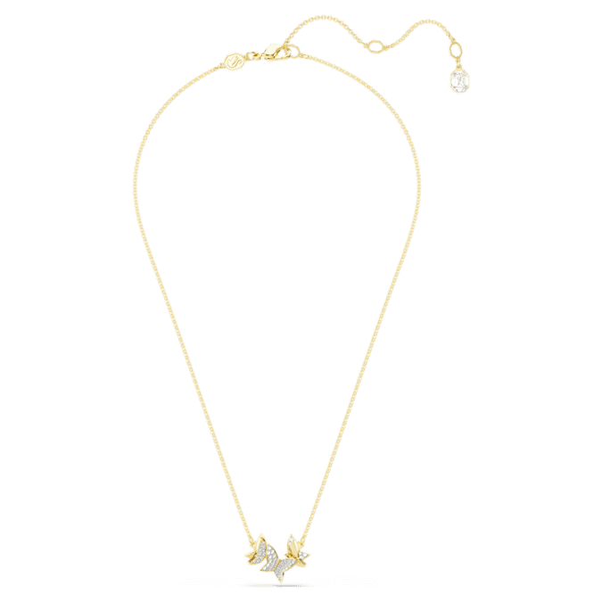 An elegant choice for everyday, this delicate necklace will become a new wardrobe staple. It features shimmering pavé butterfly motifs suspended from a gold-tone plated chain. The perfect partner to white T-shirts, cashmere jumpers, denim, or eveningwear – essentially, anything goes.