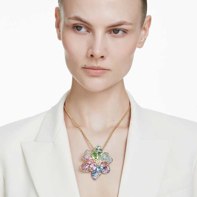 Embrace the collision of color in this nature-inspired pendant. Expertly crafted using all of Swarovski’s finest savoir-faire, including pavé, Pointiage™, and chatonnage techniques, the showstopping design features an array of crystals in multiple shapes, shades, and sizes, resulting in a wondrous flower motif that forever stays in full bloom. The jewelry is suspended from a gold-tone plated chain and also has the versatility of being worn as a brooch.