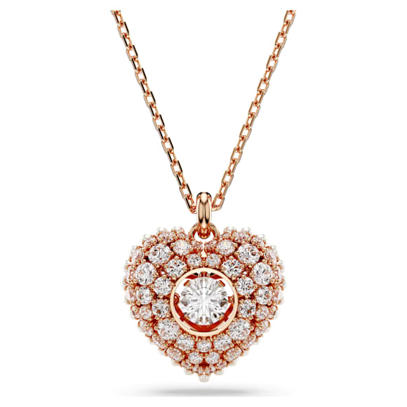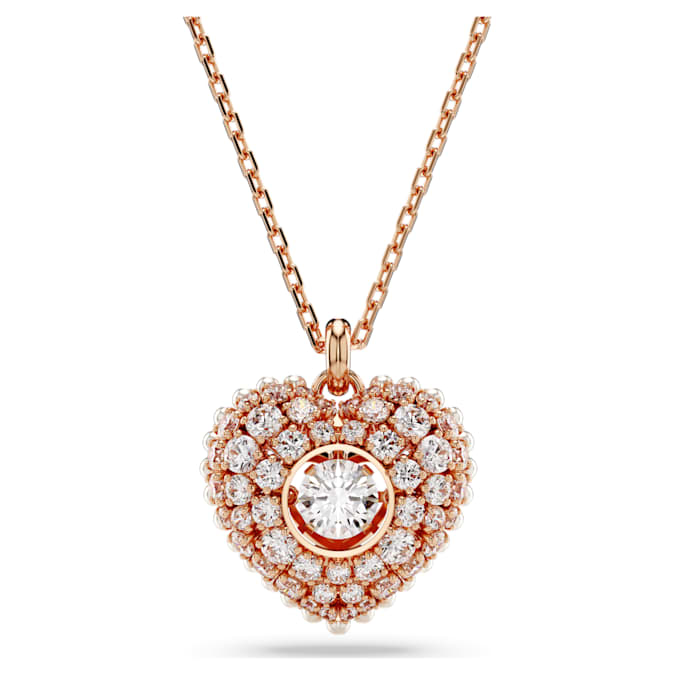 This adorable heart pendant is the perfect display of Swarovski’s exquisite savoir-faire. The rose gold-tone plated motif has been created with a cage design for maximum volume, with tiny white Crystal Pearls around the edges. To enhance the domed effect, the heart is adorned with clear Swarovski Zirconia, set in place using the dazzling chatonnage technique, while at the center, a round dancing Swarovski Zirconia catches the light from every angle. A romantic way to add warmth and light to your style.
