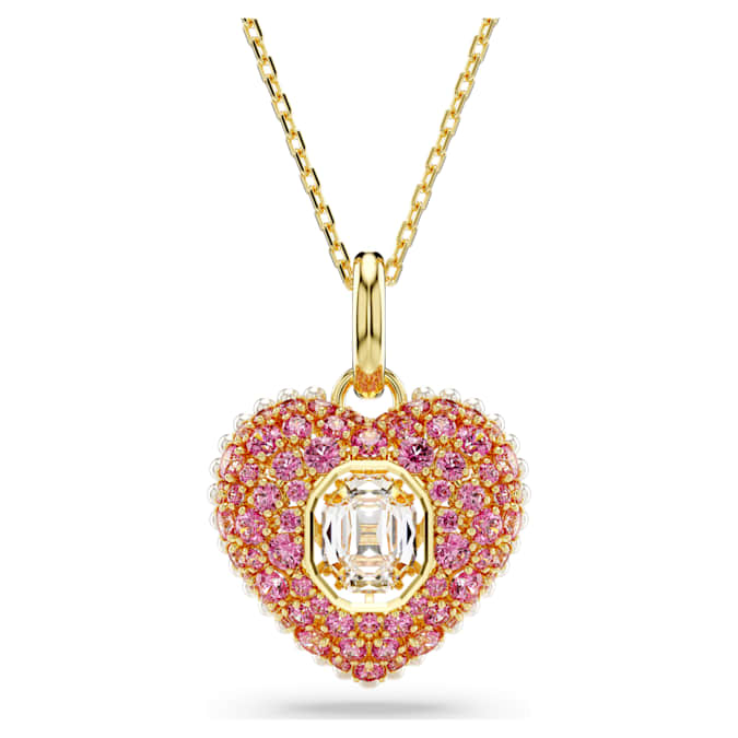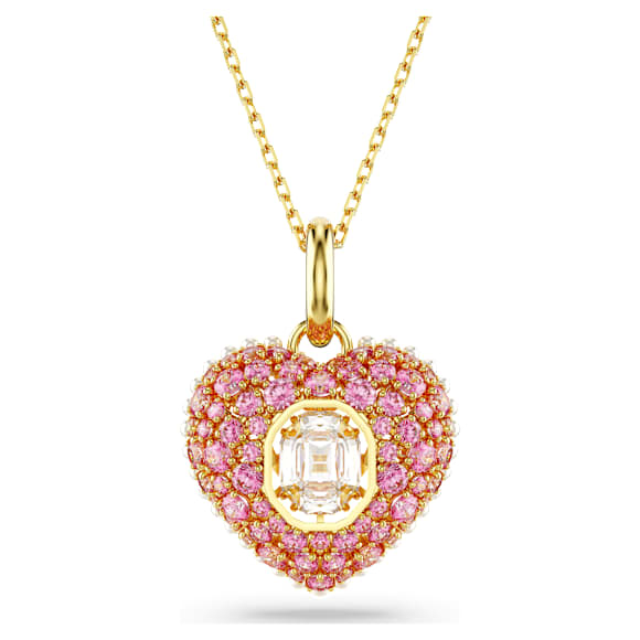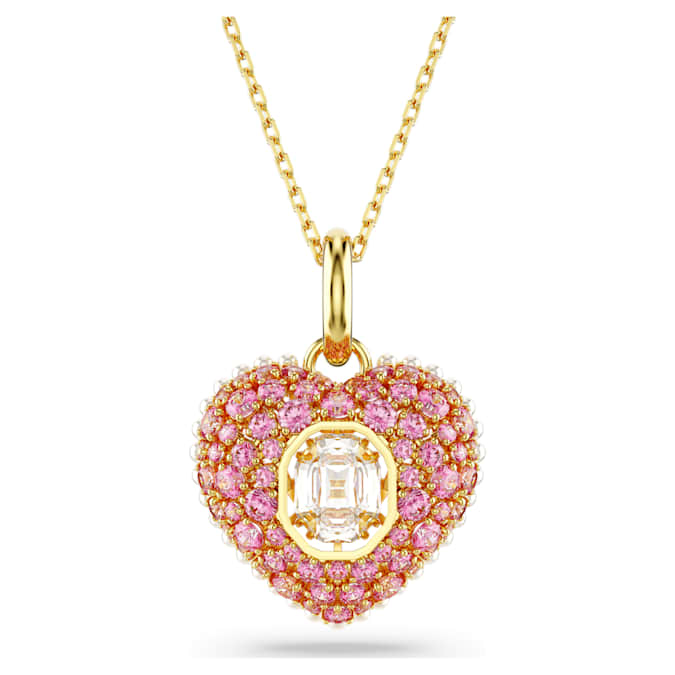 Let your heart be captured by this striking Swarovski pendant. The gold-tone plated motif has been created with a cage design for maximum volume and features an array of tiny white Crystal Pearls around the edging. To enhance the domed effect, it is adorned with round pink Swarovski Zirconia, set in place using the dazzling chatonnage technique, while at the center, an octagonal dancing stone catches the light from every angle. Gift this as a special surprise to someone you adore.