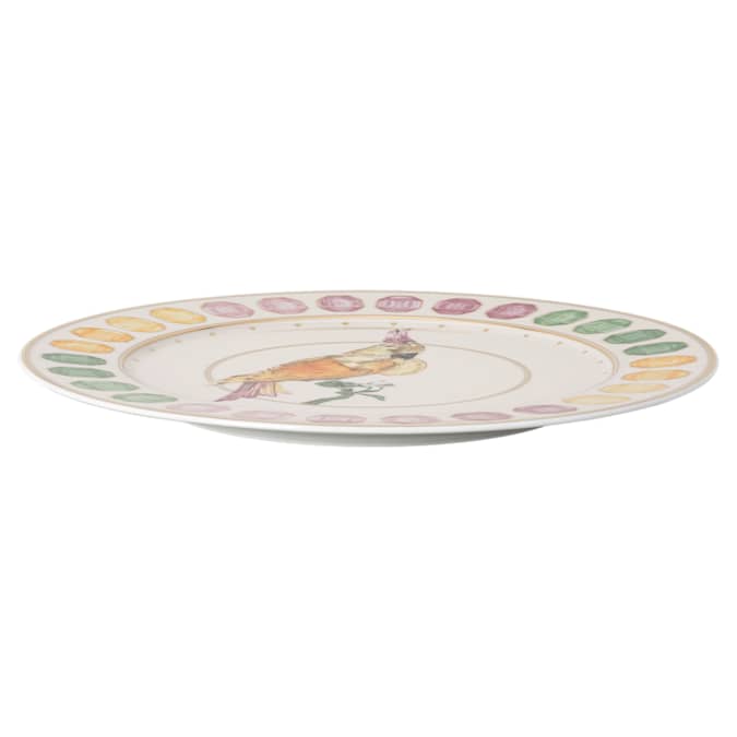This stunning Idyllia service plate is crafted to add color and joy to any table. Using an exclusive technique, the marshmallow porcelain is printed with a wondrous motif that captures the essence and radiance of crystals. This includes a vibrant gemstone print around the outside, and a lively cockatoo at the center. Created in partnership with porcelain brand Rosenthal, it is further decorated with fine gold-tone lines for a beautiful finish. This service plate is dishwasher safe, but not suitable for use in a microwave.