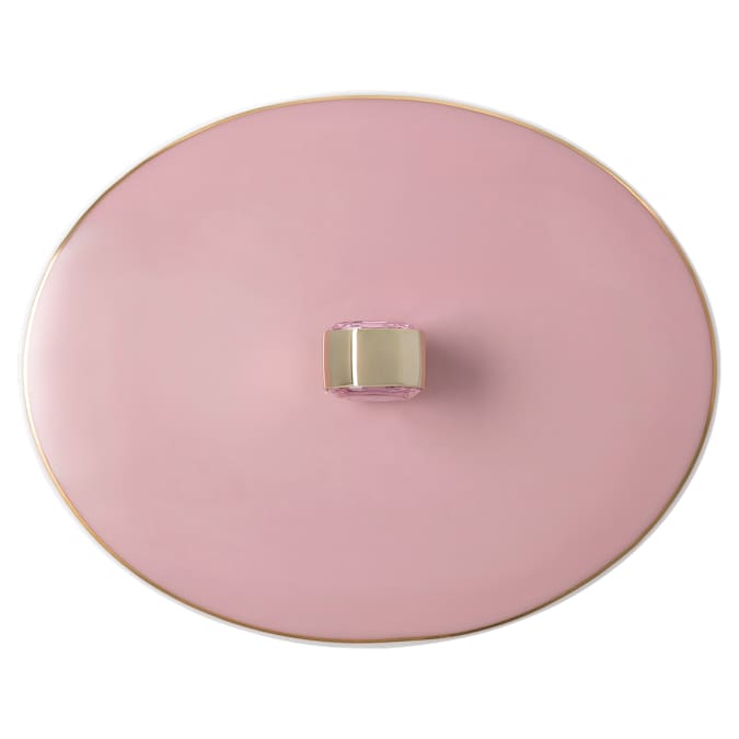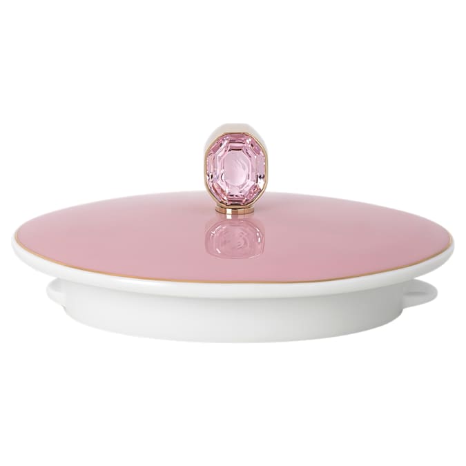 This faceted teapot is inspired by the wonders of the Swarovski Mathemagical Garden. One side displays a bright bouquet of flowers, while on the other side, there is a majestic royal flycatcher perching on a lemon. These joyful motifs are printed on the pink and marshmallow porcelain using an exclusive technique that captures the essence and radiance of crystals. Created in partnership with porcelain brand Rosenthal, it is further decorated with fine gold-tone lines, a hand-painted gold-tone spout, and an octagonal pink crystal on the lid. This teapot is dishwasher safe, except for the lid, and should not be used in a microwave.