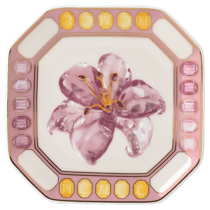Bring joy into your home with this cheerful Idyllia vide poche. Using an exclusive technique, the pink and marshmallow porcelain is printed with a bright lily motif that captures the essence and radiance of crystals. Created in partnership with porcelain brand Rosenthal, it is further decorated with fine gold-tone lines, giving you a nature-inspired touch to any décor. This vide poche is dishwasher safe, but not suitable for use in a microwave.