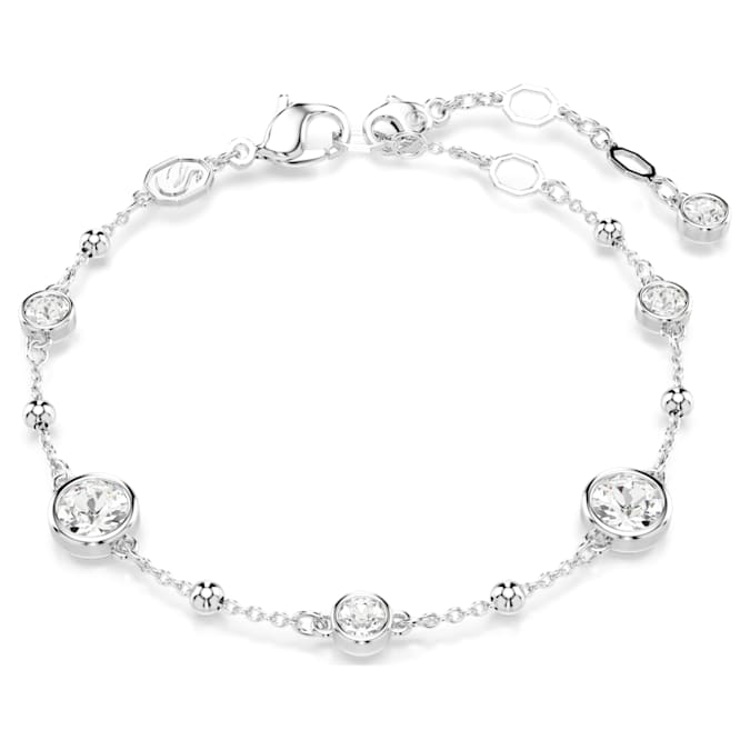 With its dynamic strand of metal droplets, this Imber bracelet will give your wrist a distinctive shimmer. The rhodium plated design is accented with dazzling round-cut crystals in a puffy bezel setting. Completed with a lobster closure and extra elongation, the bracelet can be worn as a single piece or paired with a matching set of studs from the same family.