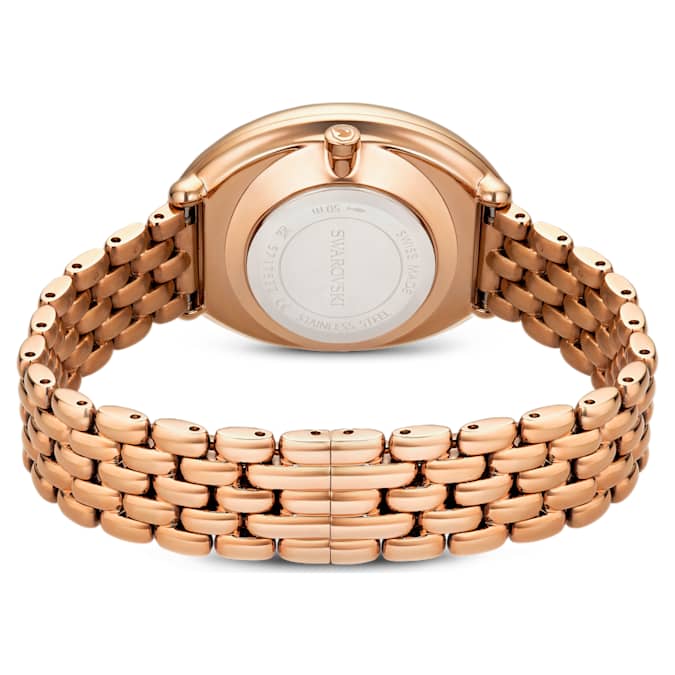 The Imber timepiece conveys a modern approach to watchmaking through its glittering dial and timeless elliptical shape. This 24 x 26.3 mm stainless steel version is rose gold-tone finished and features around 1000 clear crystals on its Crystalline dial. Amongst the slender hour markers, a single Roman numeral is displayed at 6 o’clock, while Swarovski’s iconic swan is placed at 12 o’clock. The Swiss Made watch is worn on a polished metal bracelet and offers a water resistance of 50m. Make this your go-to choice for sophisticated day-to-night styling.