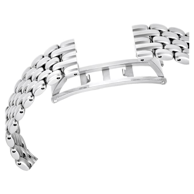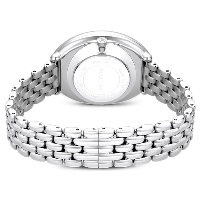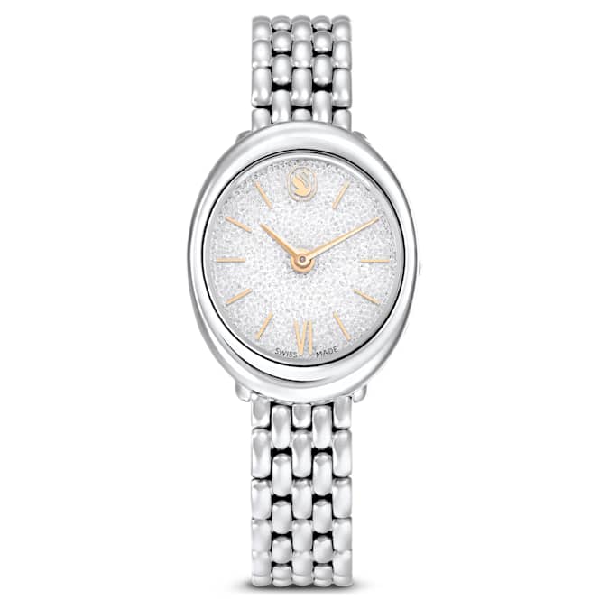 The Imber timepiece conveys a modern approach to watchmaking through its glittering dial and timeless elliptical shape. This 24 x 26.3 mm version is crafted in stainless steel and features around 1000 clear crystals on its Crystalline dial. Additional details are gold-tone finished, including the hour markers and hands, as well as the single Roman numeral at 6 o’clock, and Swarovski’s iconic swan logo at 12 o’clock. The Swiss Made watch is worn on a polished metal bracelet and offers a water resistance of 50m. Make this your go-to choice for sophisticated day-to-night styling.