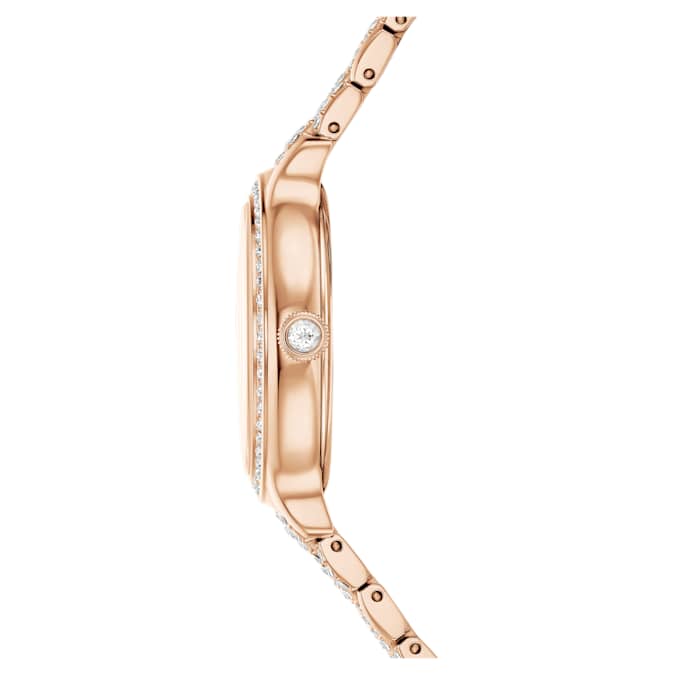 Adorned with 232 individual crystals, this glistening Imber watch is Swarovski’s finest expression of timeless elegance. The 31mm stainless steel design is rose gold-tone finished and features a pavé bezel set with 52 clear crystals, while one additional crystal is also placed within the crown. On the sunray dial, 11 crystals in small and large sizes are used to mark the hours, along with a swan logo at 12 o’clock. Around the wrist, the watch’s most distinctive feature is the adjustable seven-link bracelet, which is stunningly set with 168 round-cut crystals. This Swiss Made watch is water resistant to 50 meters and matches seamlessly with Swarovski’s selection of Imber jewelry.